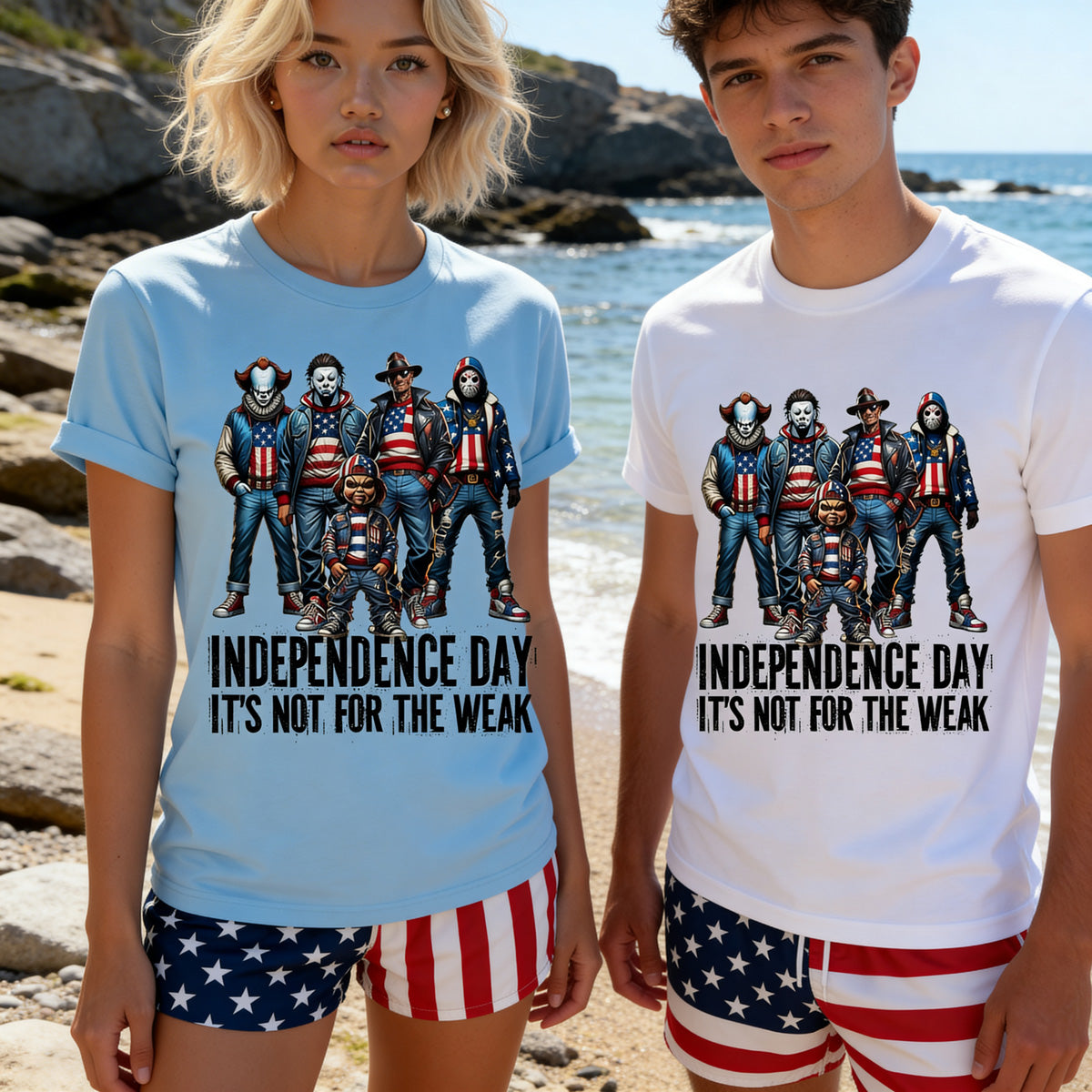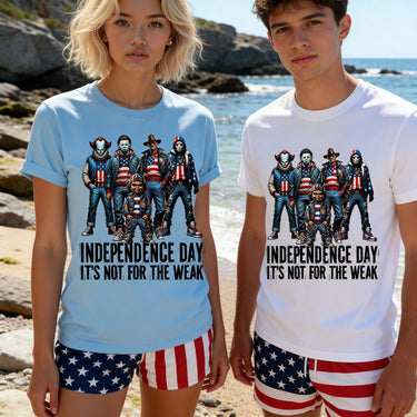 Celebrate Independence Day with a twist! This playful t-shirt features iconic horror movie characters decked out in American flag attire, perfect for those who like their patriotism with a spooky edge. Made for fans who aren’t afraid to stand out, it’s a fun way to show your festive spirit with a dash of fright. Comfortable and eye-catching, this tee is sure to be a conversation starter at any Fourth of July gathering.